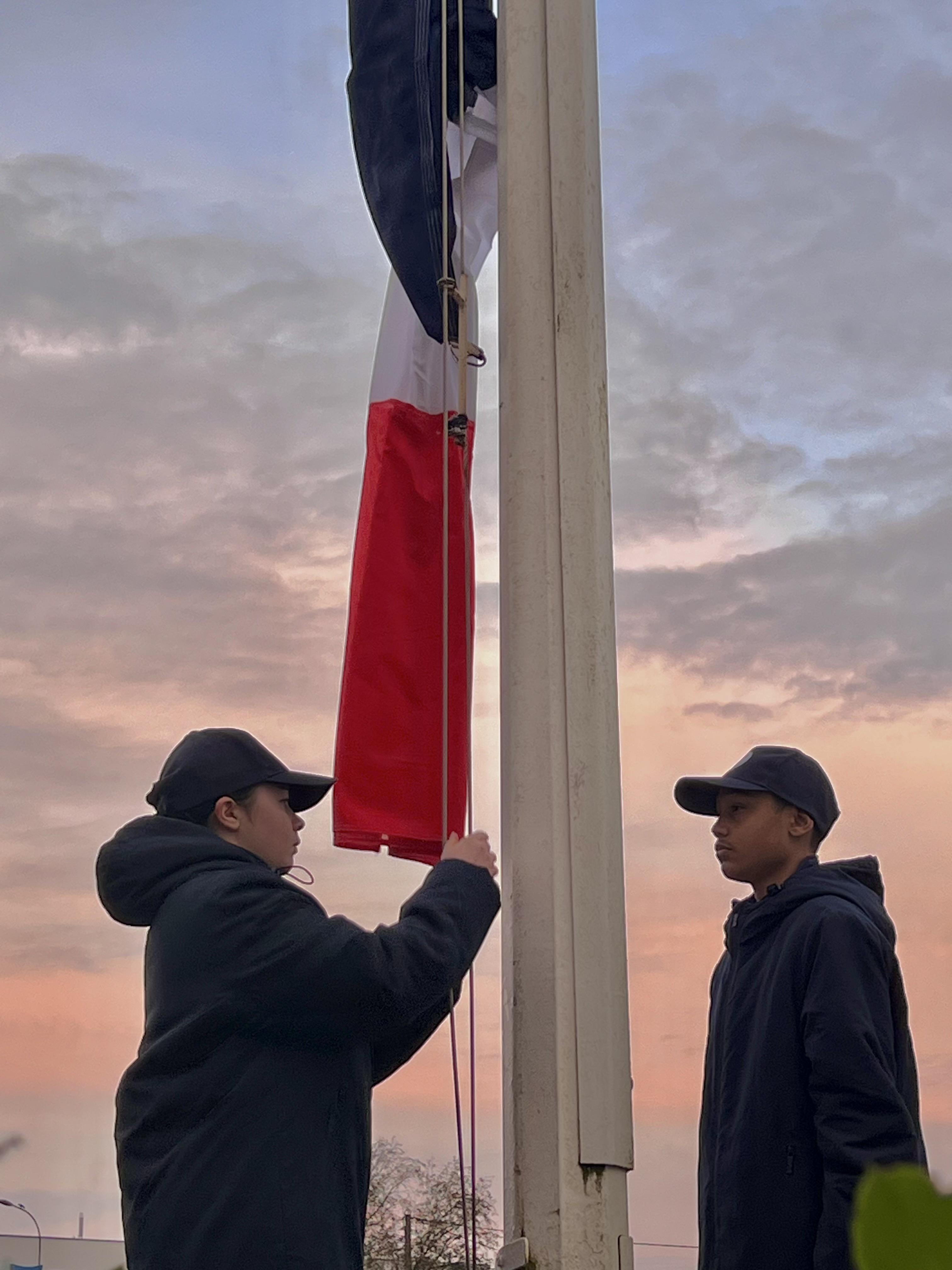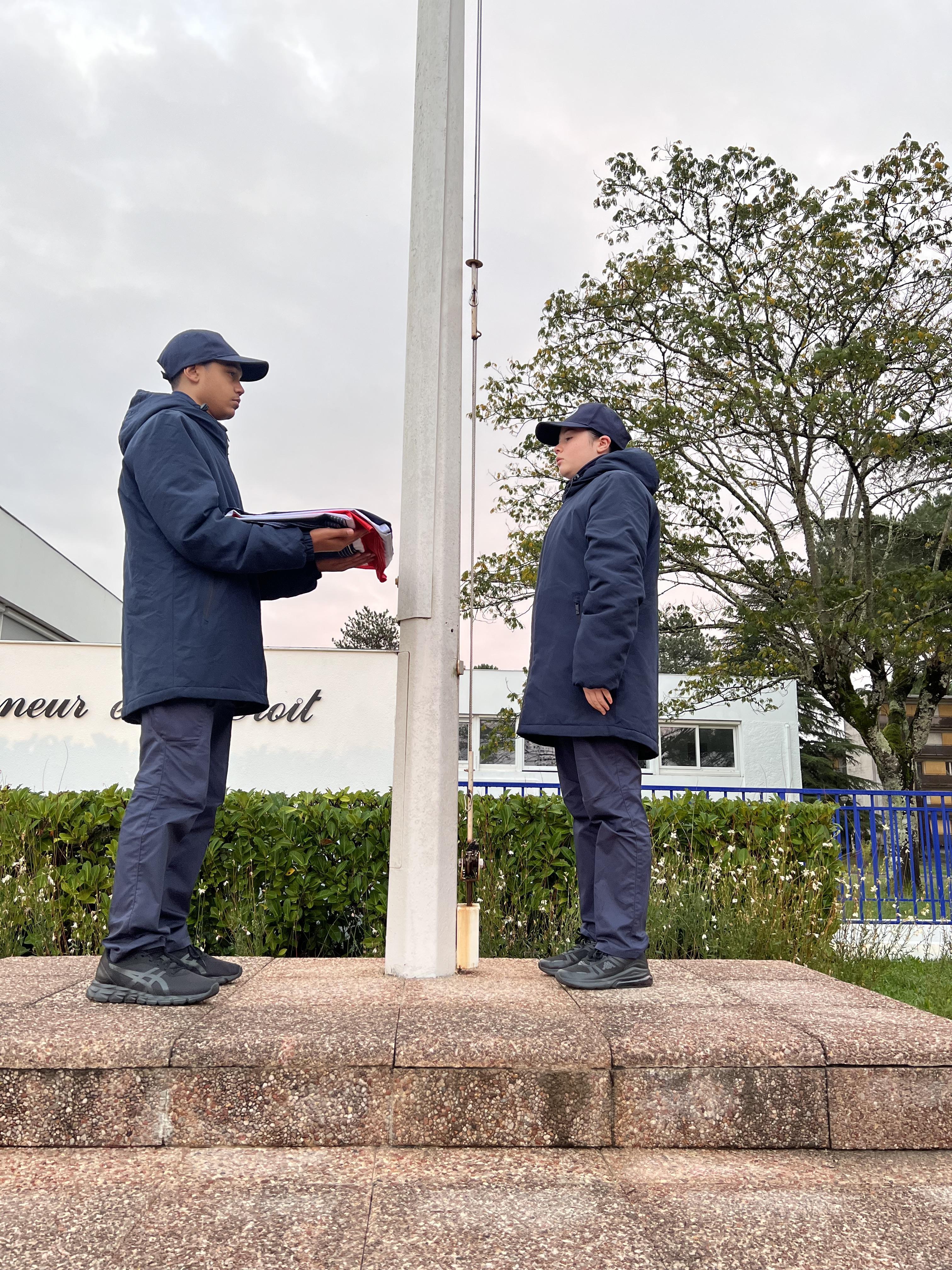 La levée des couleurs à 08h00 ce dimanche matin accomplie par 2 cadets ... une première pour eux, un moment solennel et une fierté.