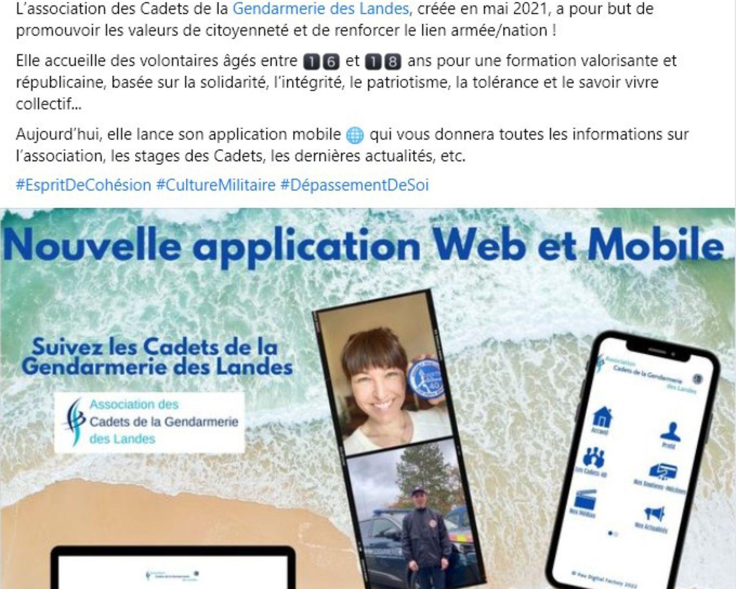 La page Facebook de la Gendarmerie des Landes  a fait une publication afin de promouvoir notre nouvelle application web et mobile des Cadets de la Gendarmerie des Landes.