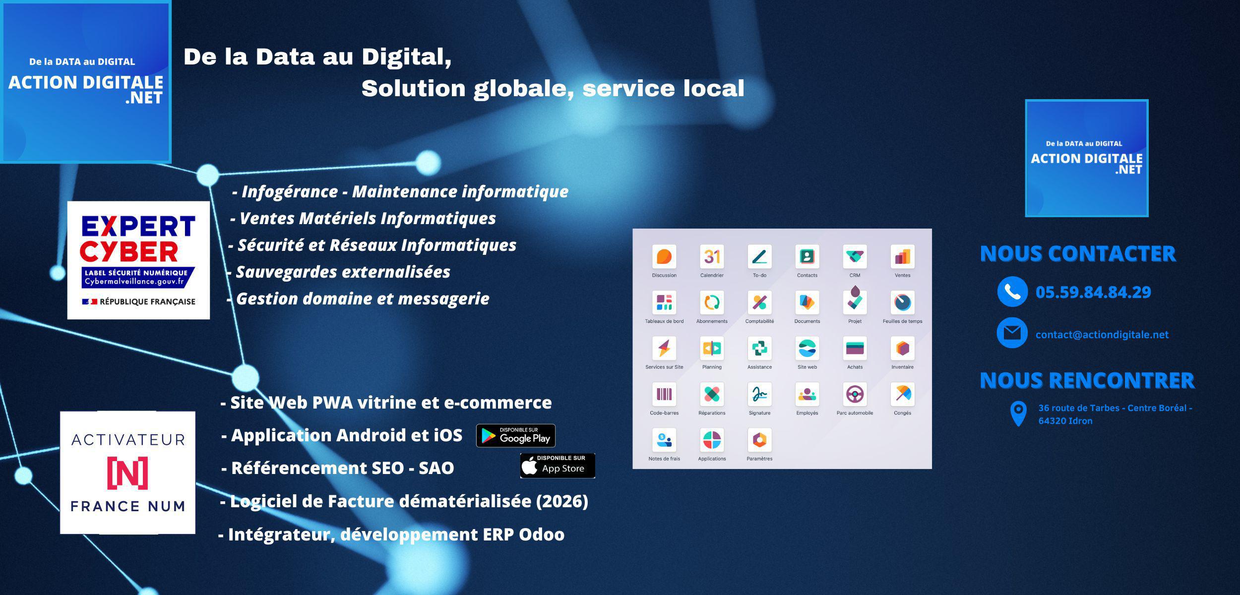 Fondée à Pau à l’époque d’Odoo V9, Action Digitale a grandi en gardant un cap clair : proposer un accompagnement humain, expert et durable.